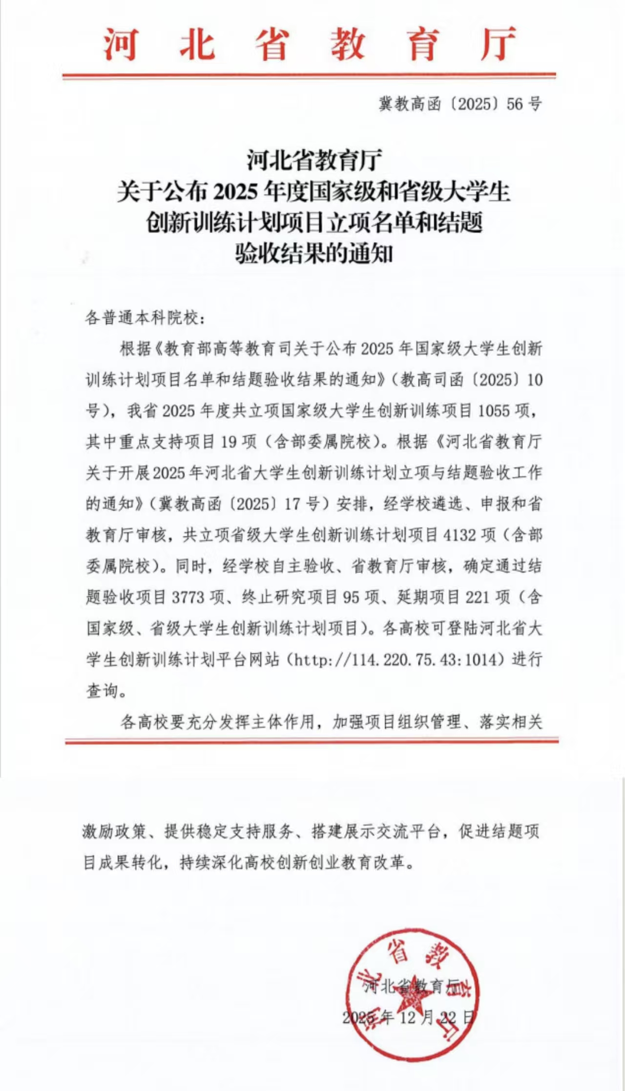 近日,河北省教育厅公布《2025年度国家级和省级大学生创新训练计划项目立项名单和结题验收结果的通知》(冀教高函〔2025〕56号)。经学校遴选、自主验收、申报及省教育厅审核,我校2024年度立项的20个省级大学生创新训练计划项目全部顺利通过结题验收,2025年度新获批省级立项30项,立项数量与结题质量均实现稳步提升,彰显了我校创新创业教育改革的扎实成效。