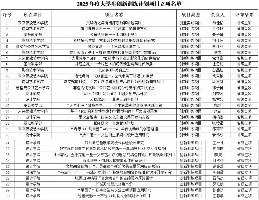 在本次结题验收中,20个省级项目聚焦文化传承、数字创新、乡村振兴等多个领域,成果亮点纷呈,充分展现了我校学子的创新思维与实践能力。2025年度新立项的30个省级项目延续了“创新赋能、特色发展”的导向,选题紧密结合河北地域文化、非遗传承、数字技术应用等热点方向。